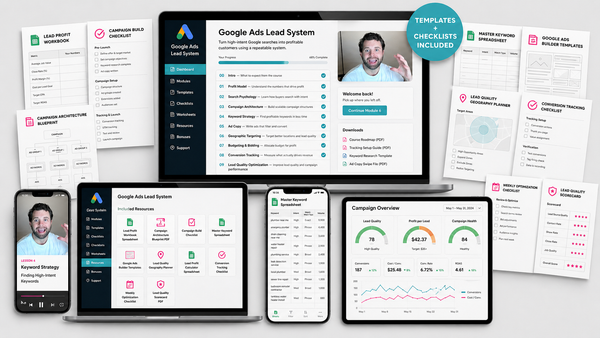 The full A-to-Z system: profit modeling, keyword strategy, campaign architecture, ad copy, geo-targeting, bidding, conversion tracking, and weekly optimization. (9 Modules)